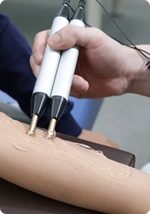 マイオパルス施術患部に専用ジェルを塗り、体の状態を読み取ります。患部の状態に合わせて細胞の電位を安定させ、痛みを軽減させていきます。